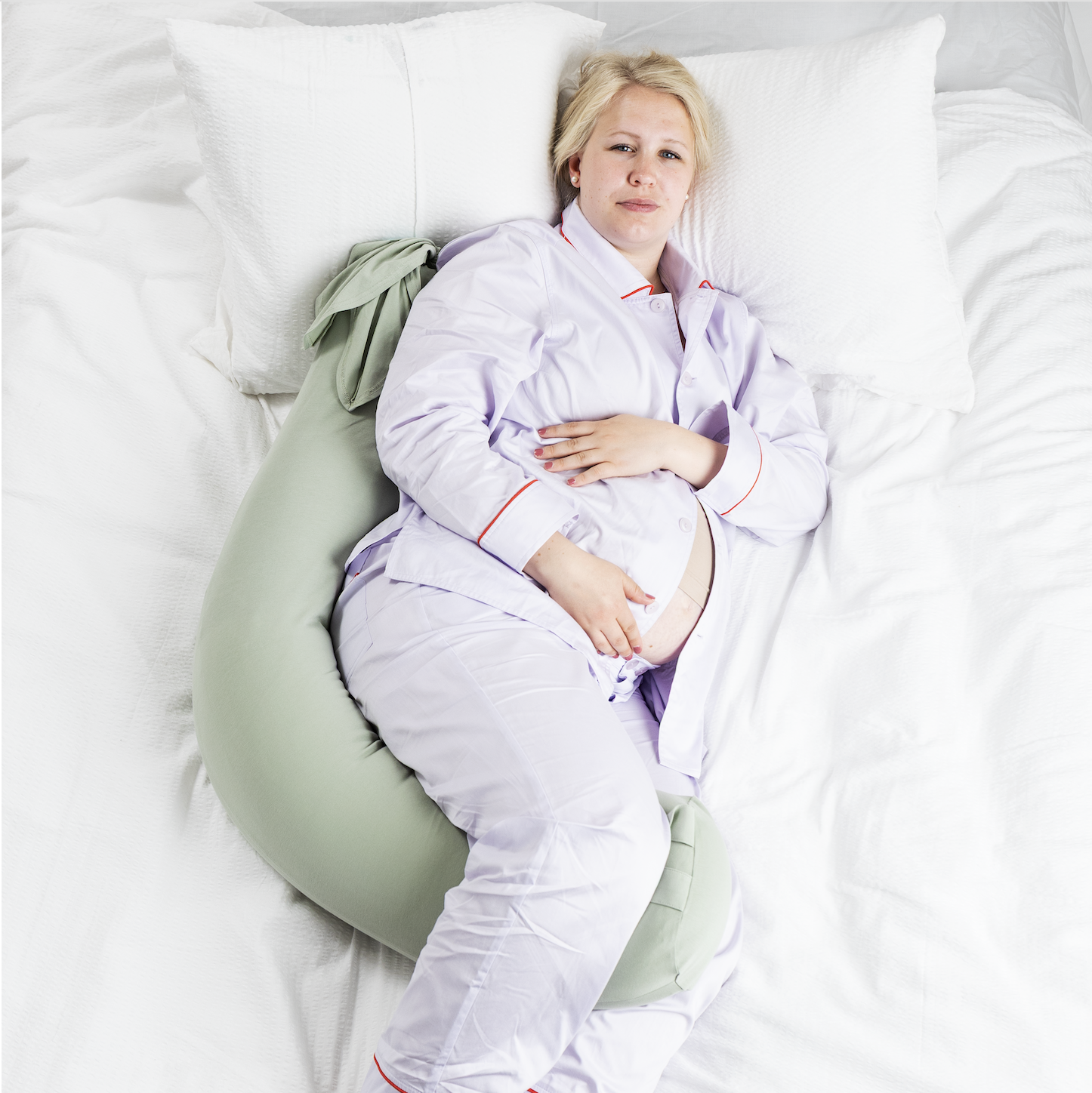 Brug puden i sin lange, lige form, og læg dig tæt op ad den på siden – gerne på venstre side. Den giver støtte til fem områder: mave, ryg, hofter, knæ og ankler, hvilket hjælper med at aflaste trykpunkter og samtidig opretholde en god kropsstilling.