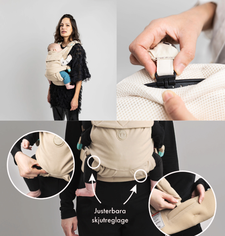 Easy vol. 2 bärselen har två justerbara sliders – en på frontpanelen och en på midjebältet. Detta gör att du enkelt kan anpassa bärselen efter ditt barns storlek, från nyfödd och uppåt, vilket gör den mer justerbar både i smala och breda inställningar jämfört med Rise. Slidern på frontpanelen gör det också möjligt att justera bärselen för olika bärpositioner, såsom framåtvänd.